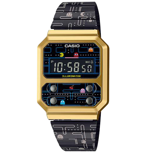 El nuevo reloj A100WEPC se basa en el reloj A100 recientemente lanzado, que retoma el diseño del F-100 original con el diseño frontal de cuatro botones. El diseño está pensado para evocar el aspecto divertido y retro del juego PAC-MAN. La esfera del reloj cuenta con coloridos personajes de PAC-MAN, y el logotipo central de ILLUMINATOR está representado con la tipografía de PAC-MAN.